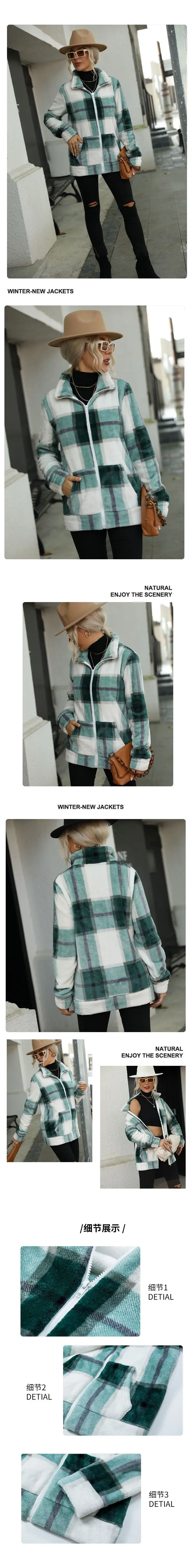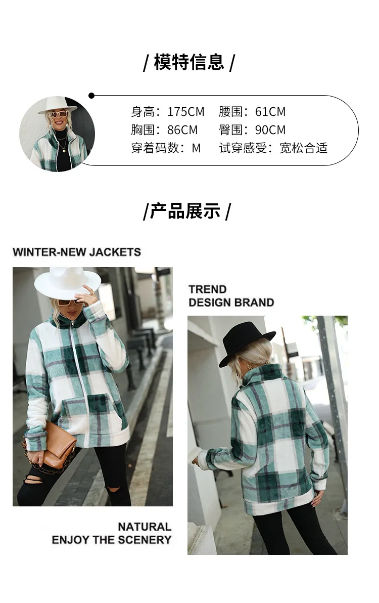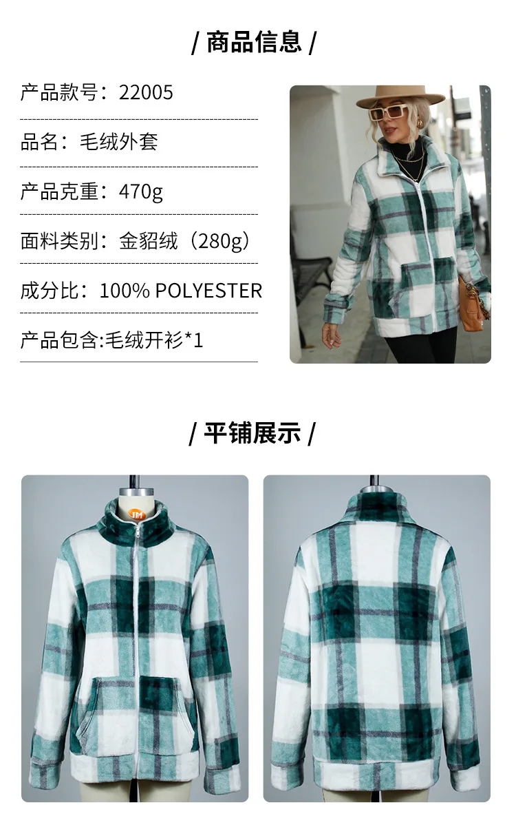 A mid-length, long-sleeved, stand-up collar, plaid zipper, loose golden mink fleece jacket for women