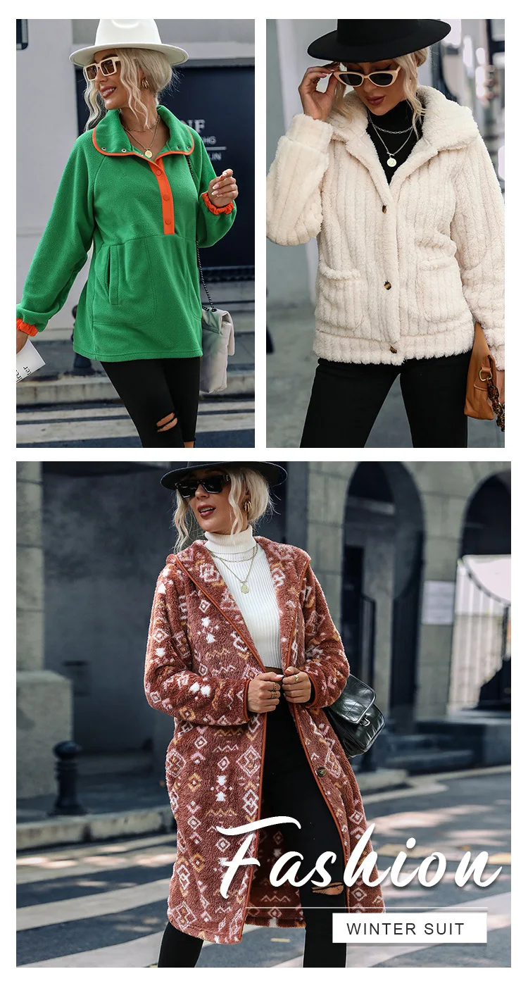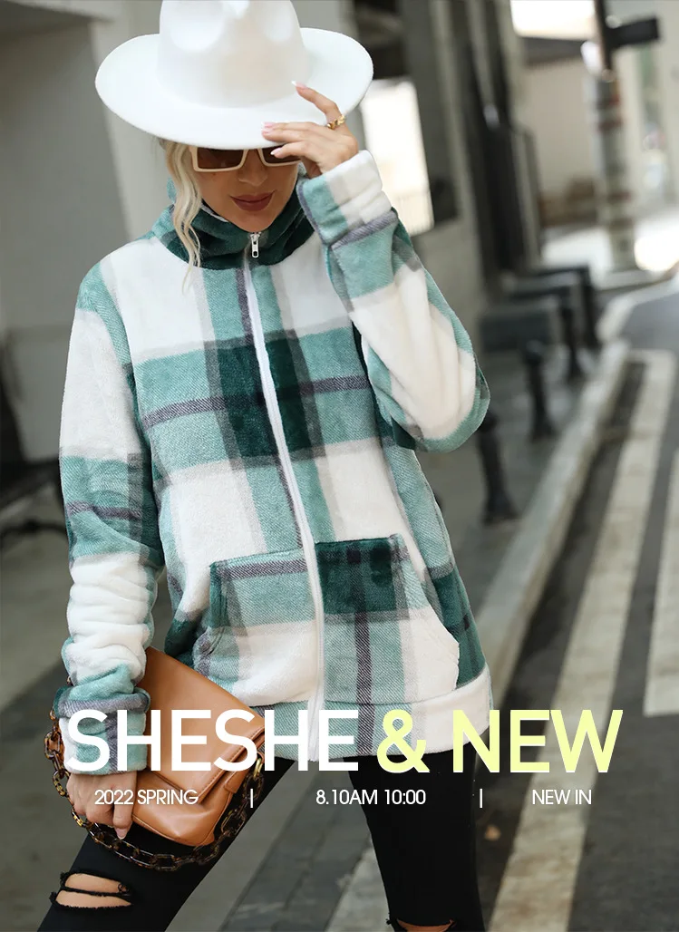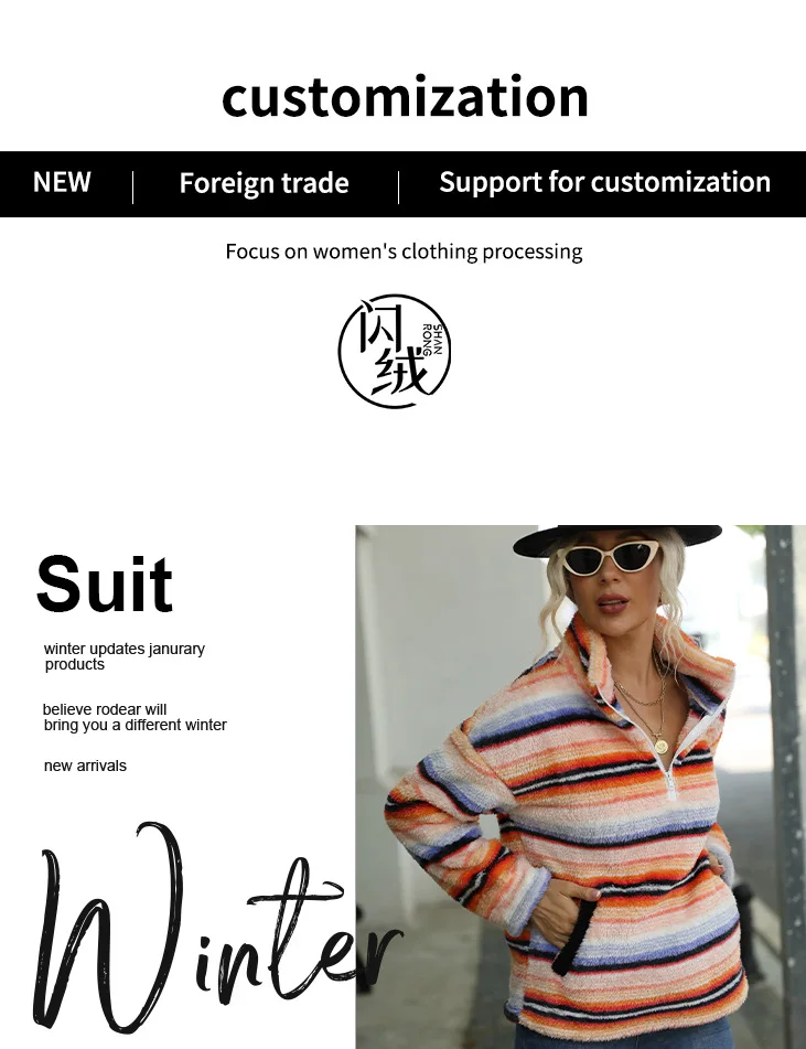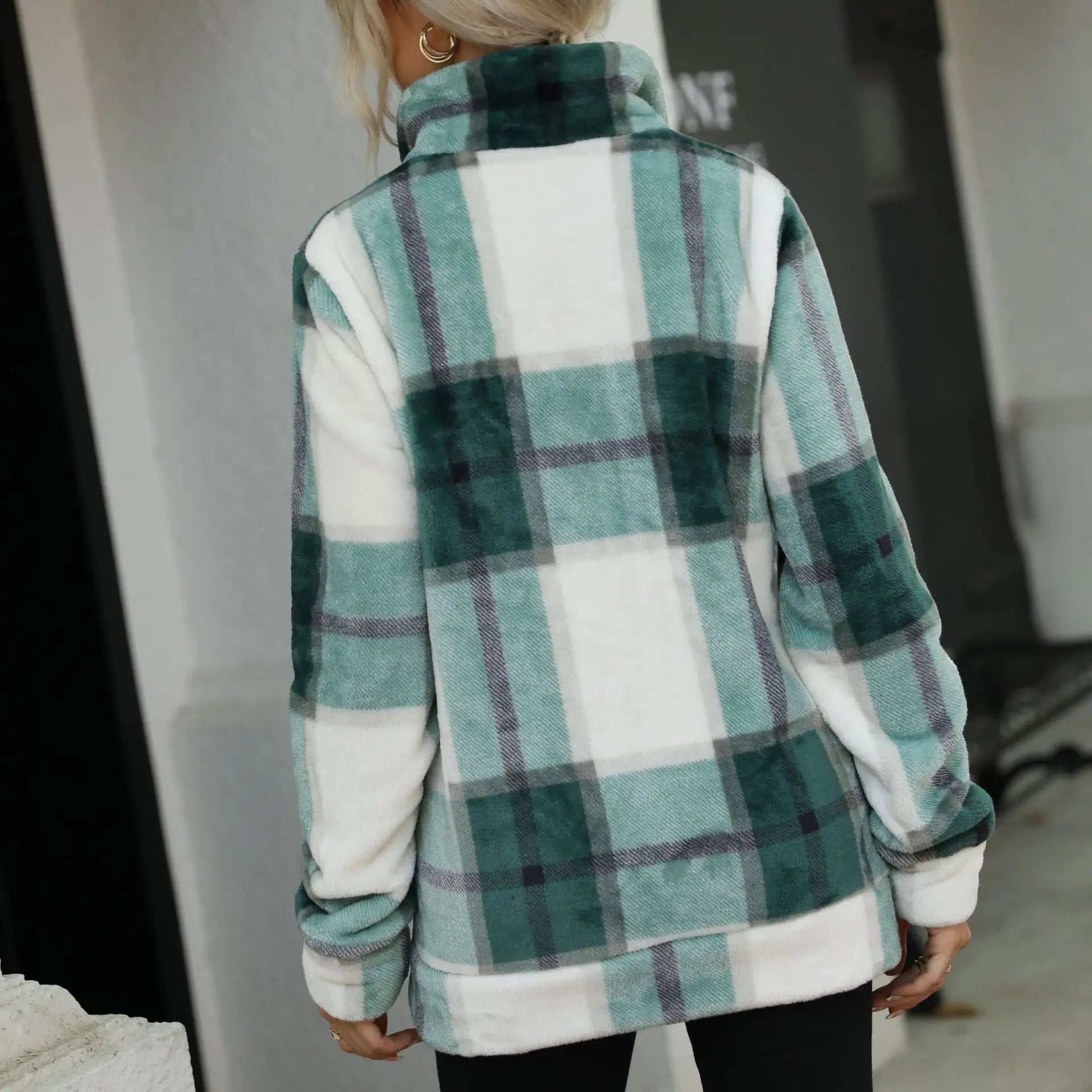 A mid-length, long-sleeved, stand-up collar, plaid zipper, loose golden mink fleece jacket for women