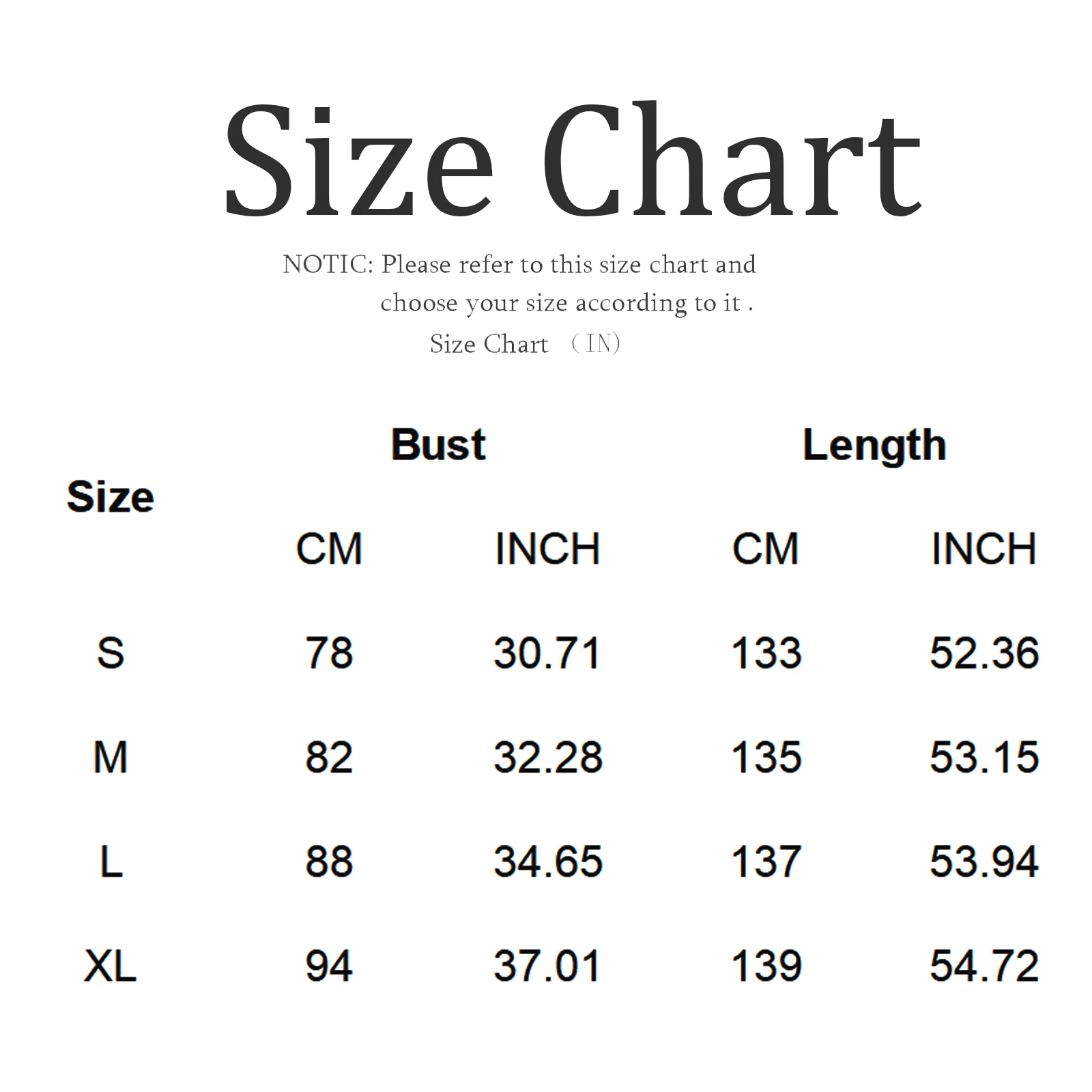 | Size | Bust | Length |