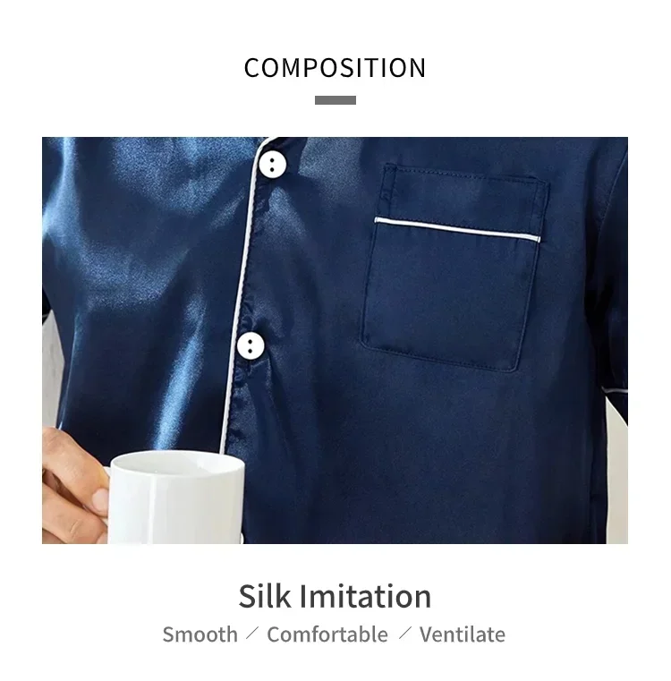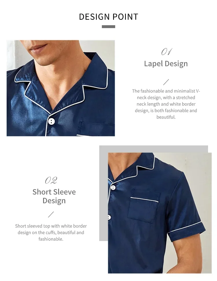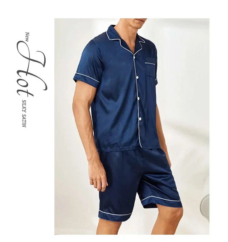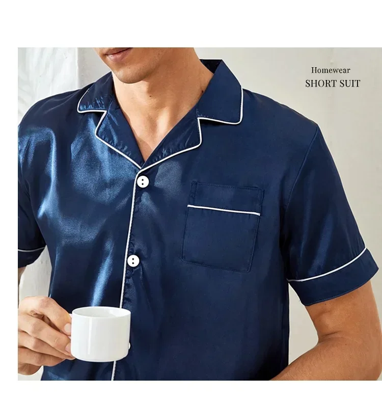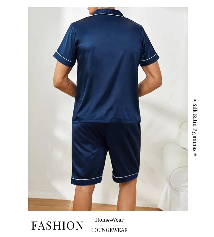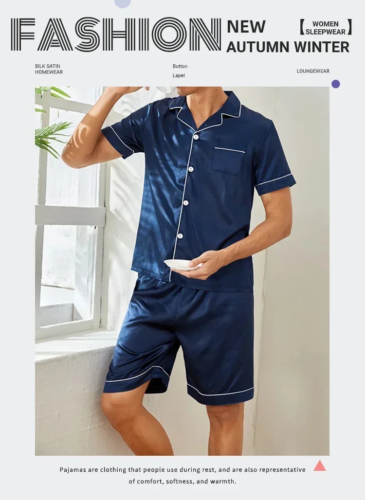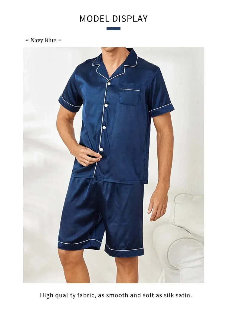 Plus Size Men's Pajama Set Faux Silk Lapel Cardigan Student Homewear Simple Short Sleeve Shorts Set Premium Feeling Solid Colour
