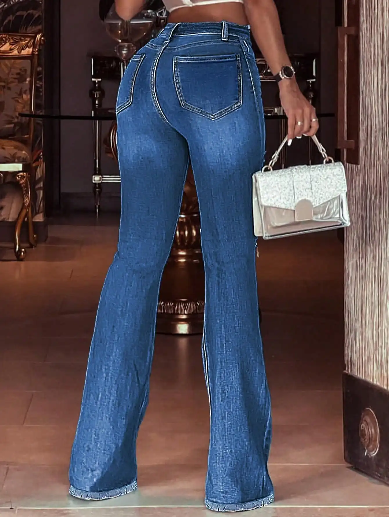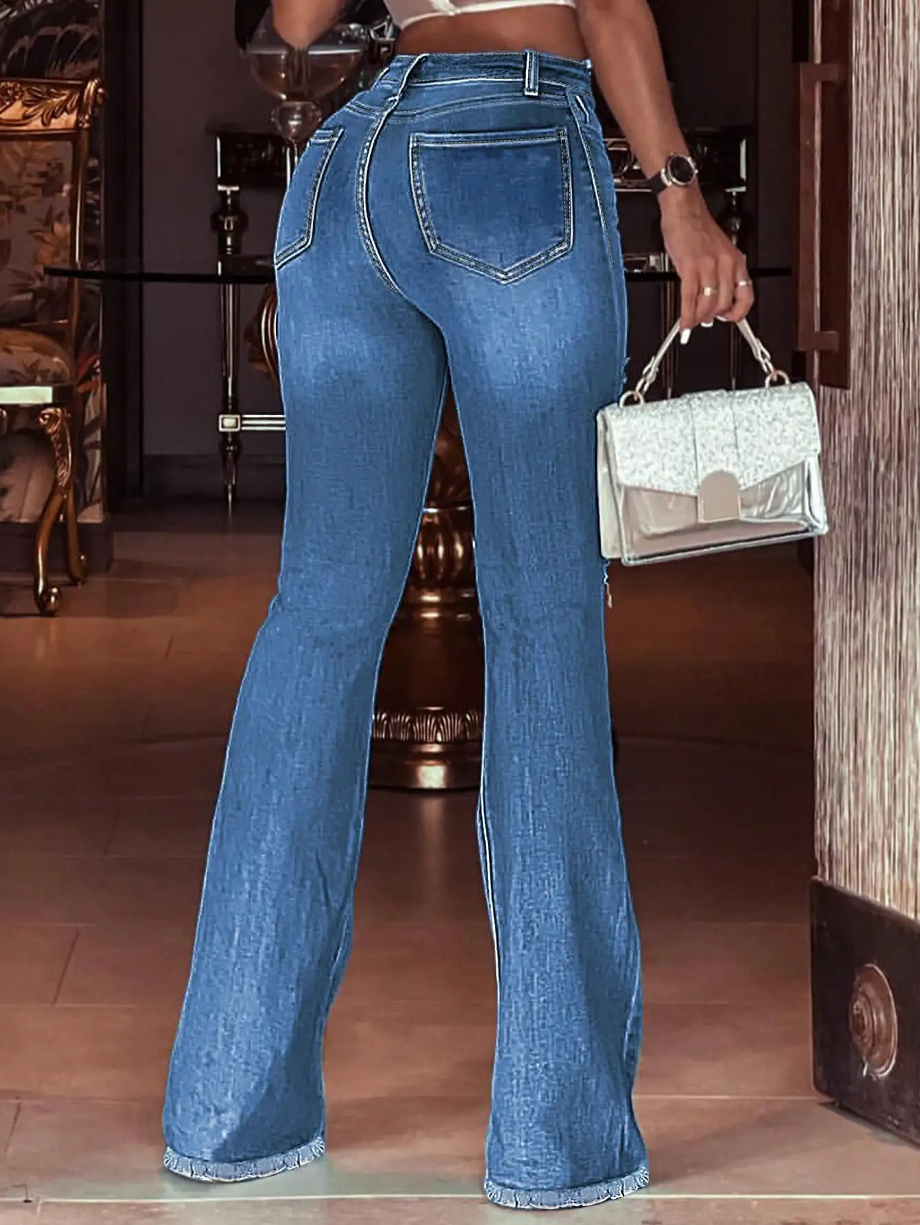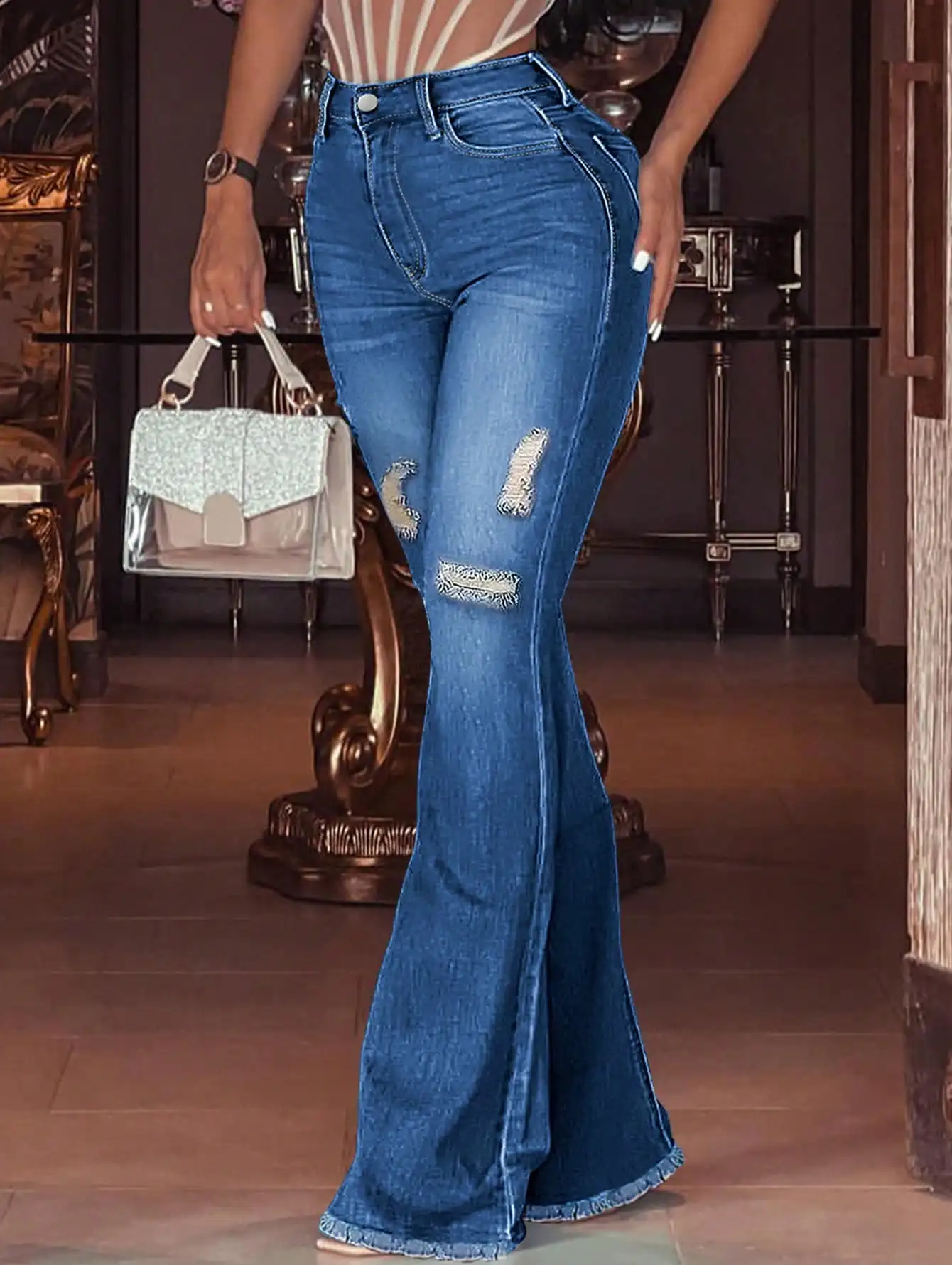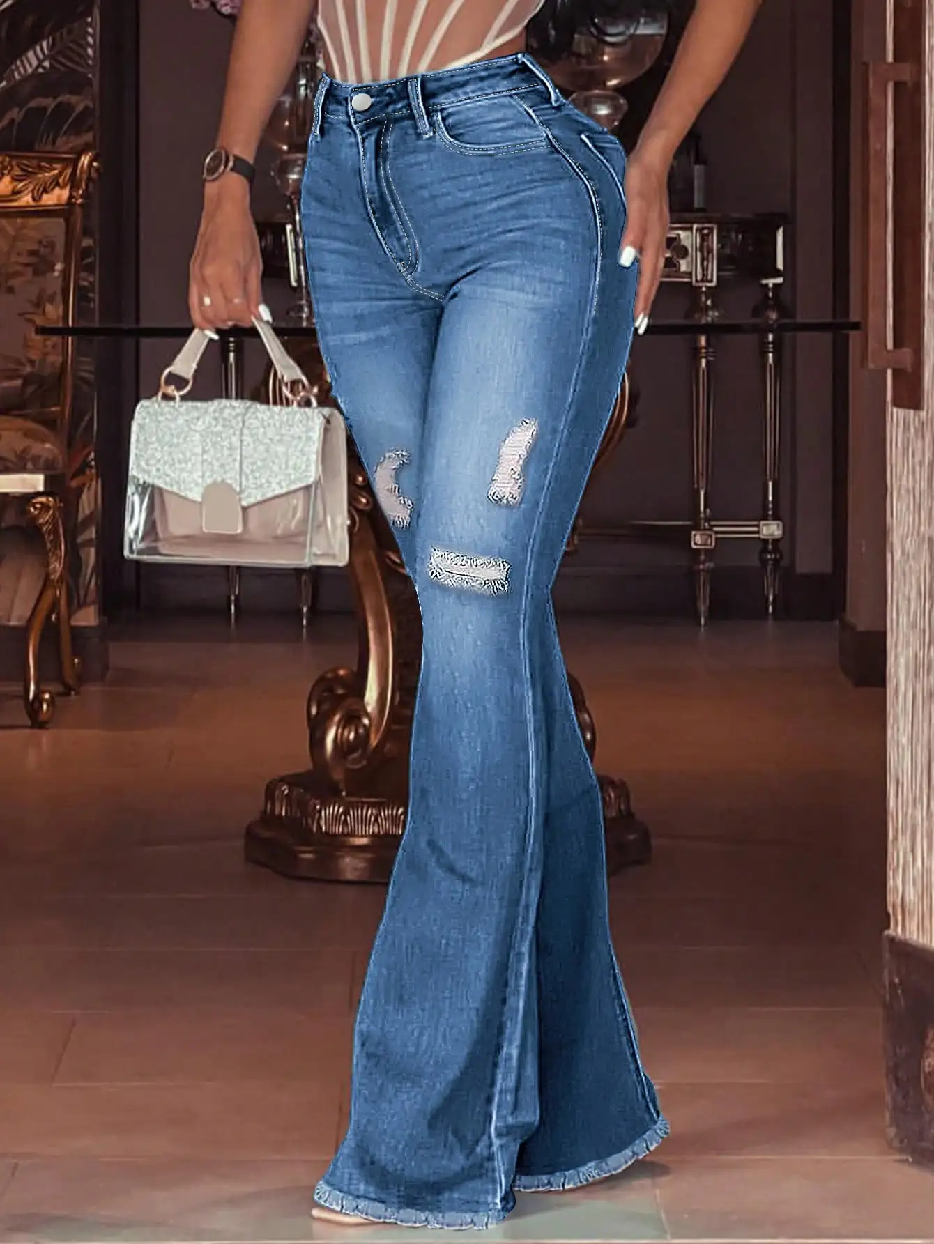 The latest retro denim street style in the 21st century, with a millennial style street look. Women's ripped flared washed retro